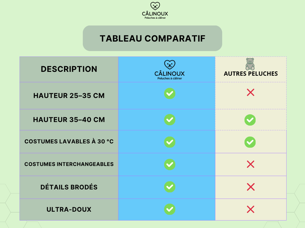 Nos peluches CÂLINOUX sont aussi pratiques qu’adorables ! Lavables en machine à 30 °C pour les garder toujours propres et douces. De plus, les costumes sont entièrement interchangeables : amusez-vous à créer de nouvelles combinaisons et changez le look de votre peluche préférée quand vous le souhaitez !
